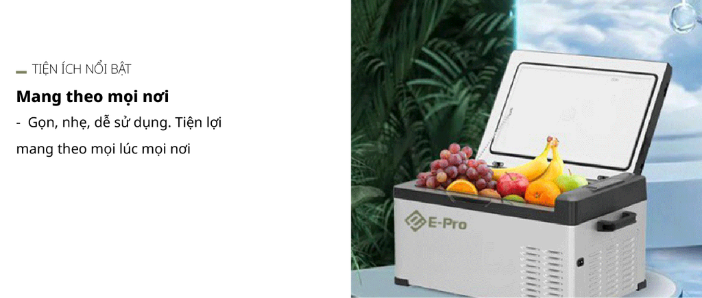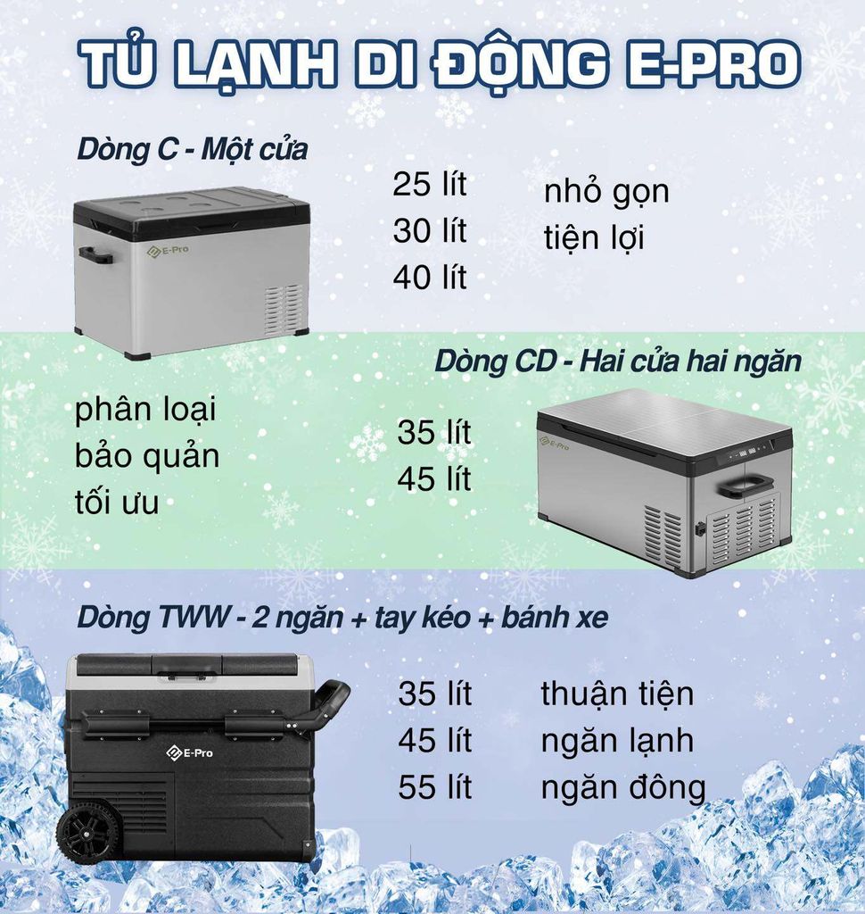Trước hết, E-Pro hiện tại có đa dạng mẫu tủ lạnh di động dành cho ô tô, dưới đây là tóm tắt các dòng phổ biến và đặc điểm nổi bật: